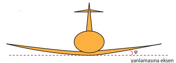 Bir uçağa önden veya arkadan bakıldığında uçağın kanadının, uçağın kanat doğrultusu boyunca uzanan yanlamasına (enine) eksen ile yaptığı açıya dihedral açısı denir. Genelde alttan kanatlı uçaklarda pozitif dihedral açısı uygulaması, üstten kanatlı uçaklarda negatif dihedral açısı (anhedral açısı) uygulaması, bazı uçaklarda (M-kanat ya da W-kanat) ise çift dihedral açısı uygulaması görülebilmektedir. Yukarıdaki şekil incelendiği zaman uçağın alttan kanat olduğu ve dihedral açısı uygulandığı görülmektedir. Doğru cevap A'dır.