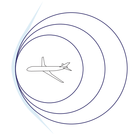 Uçak ses hızının üstünde uçuş yaptığı için oluşan basınç dalgaları bir önceki dalgayı yakalayarak onu geçmeye başlar. |
