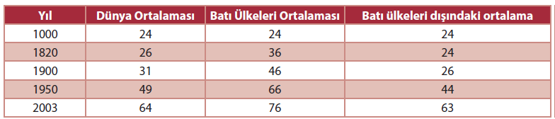Dönemler itibariyle doğuştan beklenen yaşam süreleri göz önüne alındığında 1000 yılında Avrupa ile Avrupa dışındaki ülkelerde bir farkın olmadığı, 1820 yılında bu farkın 12, 1900 yılında 20, 2003 yılında 13 olduğu görülürken farkın 22 ile en fazla olduğu dönemin 1950 olduğu görülmektedir. Dolayısıyla doğru cevap B'dir.
