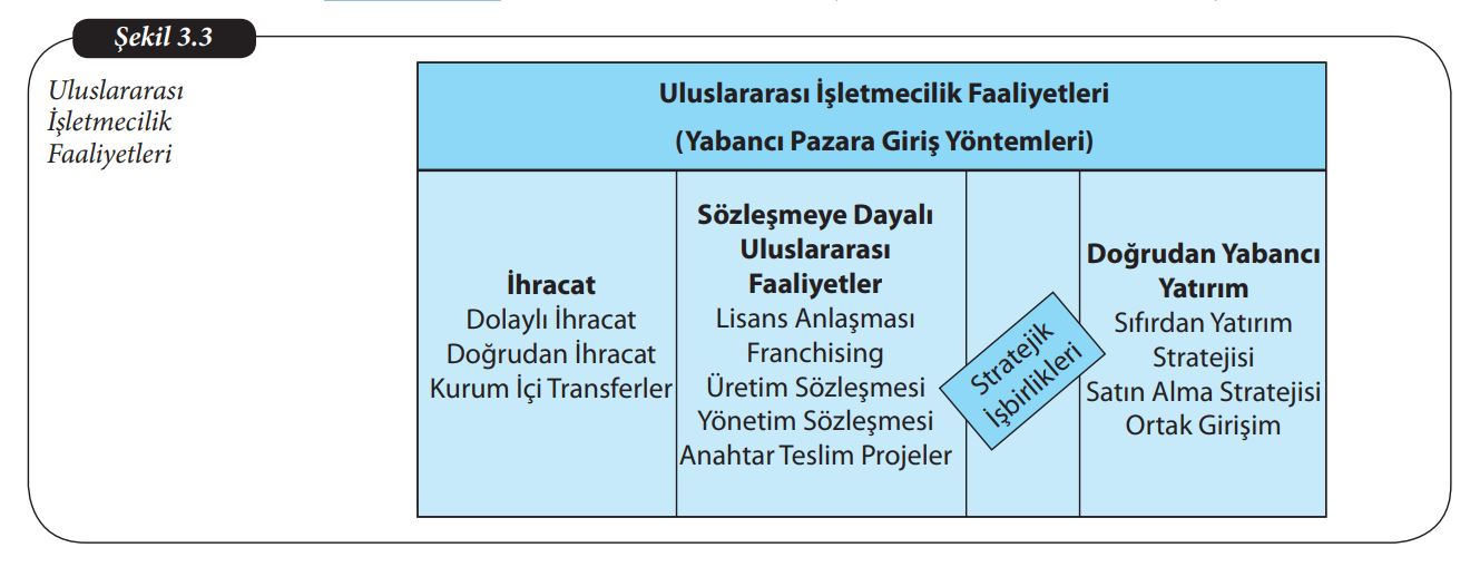 İşletmeler kaynaklara dayalı üstünlükler, bölgesel üstünlükler, uluslararasılaşmanın getirileri, iş hacmi ile diğer bazı etkenleri değerlendirerek yabancı pazarda ne şekilde varlık göstereceklerine karar verirler. Bu karar sonucunda işletme Şekil 3.3’te görüldüğü gibi, ihracat, sözleşmeye dayalı giriş yöntemleri, bir ara form olarak stratejik işbirlikleri veya yatırıma dayalı giriş yöntemlerinden uygun olanını seçerek uluslararası arenada faaliyet göstermeye başlamaktadır.