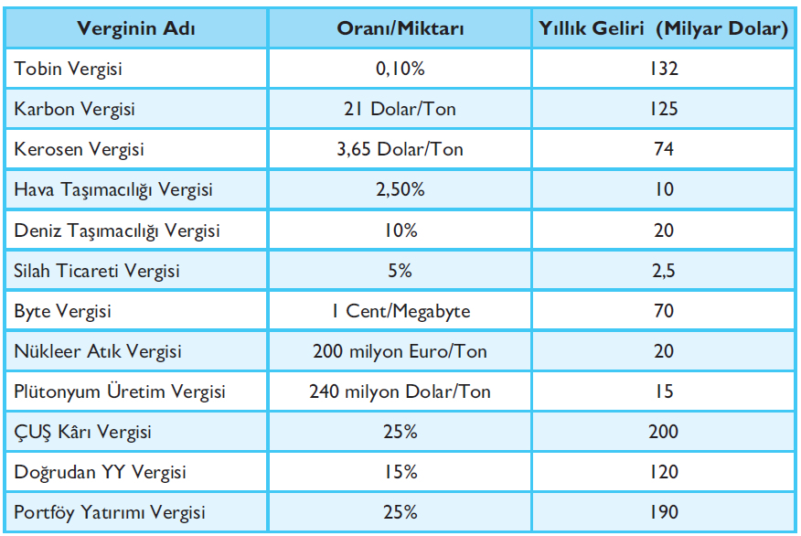 Başlıca uluslararası vergi önerileri ve bunların uygulanması durumunda yaratacakları gelir miktarları tablo 4.2’de verilmiştir.