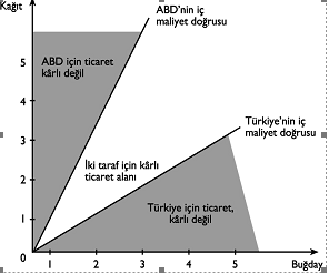 Bu örneğe göre, Türkiye ihraç edeceği 1 birim buğday karşılığında 1/2 birimden daha az miktarda kâğıt elde etmeyi öngören bir fiyattan (ticaret haddinden) dış ticaret yapmak istemez. Çünkü o takdirde kâğıdı kendisinin üretmesi daha kârlıdır. O halde Şekil 2.1’de görüldüğü gibi, iç maliyet doğrusu Türkiye için kârlı ticaret alanının sınırını oluşturur. Benzer şekilde, ABD’nin dış ticarete başlayabilmesi için ihraç edeceği 2 birim kâğıt karşılığında sağlayacağı buğday miktarının da 1 birimden daha az olmaması gerekir. Yani ABD’nin iç maliyet oranı da bu ülke bakımından kârlı ticaret alanının sınırını belirtir. Şekilde görüldüğü gibi, iç maliyet doğrularının belirlediği karlı ticaret alanı içinde ticaret hadleri, bir ülkenin yurtiçi maliyetlerine ne kadar yaklaşırsa, karşı ülkenin dış ticaret kazançları o derece artar. Daha açık deyişle, ticaret hadlerinin ABD’nin iç maliyet oranına yaklaşması Türkiye’nin, Türkiye’nin iç maliyetlerine yaklaşması da ABD’nin dış ticaret kârlarını artırır.