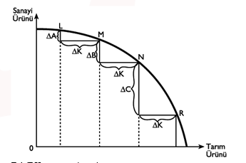 DA/DK tarım ürününün sanayi malı cinsinden maliyetini, ya da o malla arasındaki yurtiçi değişim oranını gösterir. Bu oran ise üretim olanakları eğrisinin o noktadaki eğimine eşittir ve buna sanayi ürününün tarım ürününe (ya da tersine tarımdan sanayiye) marjınal dönüşüm oranı (marginal rate of substitution) denir. İkinci bir birim tarım ürünü elde edilmek istendiğinde, M noktasında görüleceği gibi, sanayi malının üretimini DB kadar kısmak gerekecektir. Dolayısıyla üretilen ikinci birimin fırsat maliyeti DB/DK olur ki, bu oran birinciden daha büyüktür. Bu süreç boyunca her yeni birimin maliyeti giderek artar.