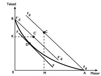 Kapalı ekonomi durumunda üretim ve tüketim noktası D, iç fiyatlar da FF'dir. Başlangıçta dünya fiyatlarının iç fiyatlara eşit olduğunu kabul edelim. Bu durumda ülkenin iki maldan birinde uzmanlaşması için D noktasındaki dengenin herhangi bir şekilde bozulması tek başına yeterlidir. Örneğin, üretim D'nin bir miktar sağına kaydırılabilirse, ülke motor üretiminde, eğer D'nin az soluna kaydırılırsa bu kez de dokumacılık alanında tam uzmanlaşır. D noktasındaki dengenin bozulması için hükümetin dıştan bir müdahalesi gerekebilir