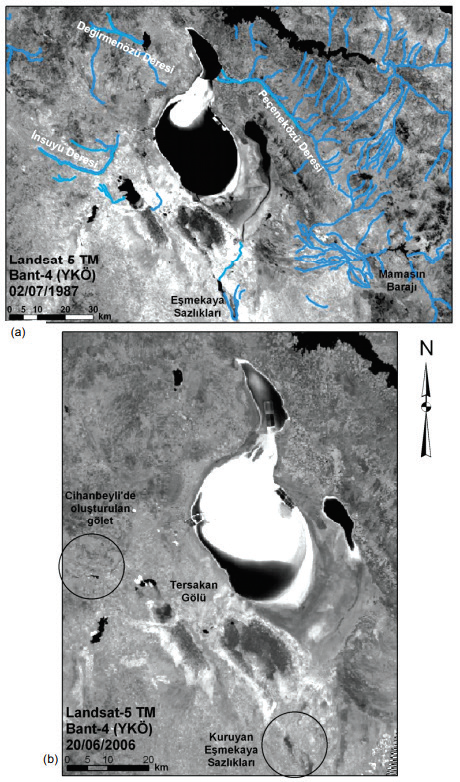 Şekil 1.4 Tuz gölü çevresinde hidrolojik olarak değişimi gösteren uzaktan algılama kara uygulamaları örneği (Landsat-5 TM uydu verileri (a) 02/07/1987 (b) 20/06/2006) (Ekercin, 2007, s.74)