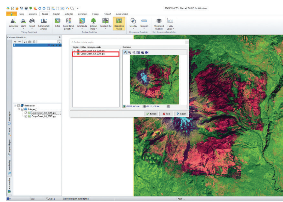 Değişim analizine girecek 2. Raster verinin seçilmesi (CougerCreek_L8_2016) |