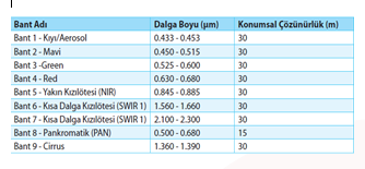 Landsat 8-OLI algılayıcısına ait spektral bantlardan hangisinin konumsal çözünürlüğü diğerlerinden farklıdır?