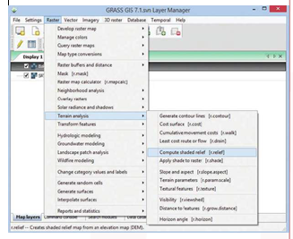 GRASS GIS 7.1 yazılımında gölgeli kabartma haritası üretimi için, raster menüsü içinde bulunan Terrain analysis sekmesinde aşağıdakilerden hangisine tıklamak gerekir?