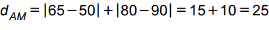 Ahmet'in yöneylem dersinden aldığı not 65 ve karar kuramı dersinden aldığı not 80 iken Mehmet'in aldığı notlar sırasıyla 50 ve 90'dır. Buna göre Ahmet ve Mehmet arasındaki Manhattan uzaklığı kaçtır?