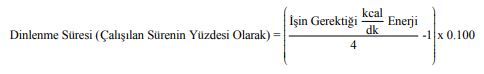 16 kcal/dk. iş yükü olan bir kişi için çalışma süresinin % 30’u kadar dinlenme süresi öngörülmektedir ki bu yaklaşık dakikaya denk gelmektedir.