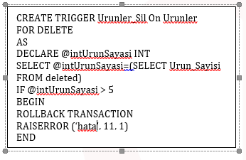 IF @intUrunSayasi > 5 şartı beşten büyük olan ürünler FOR DELETE bakarak siliniyor.