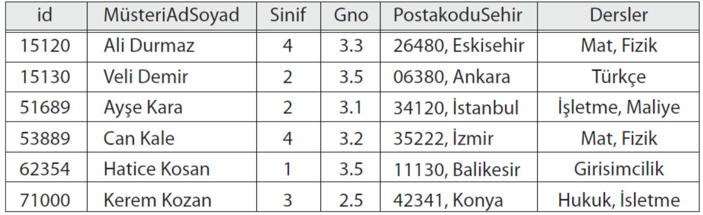 Aşağıdaki müşteri bilgileri tablosunda Dersler alanı hangi tür bir alandır?