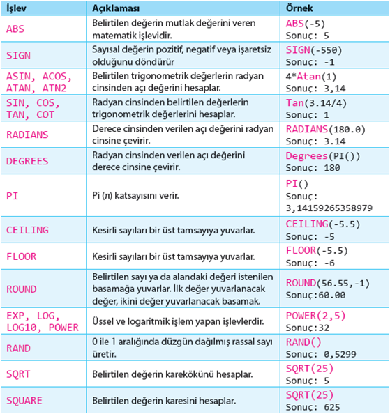 Sayısal veri tiplerinde tamsayı (integer), kayan noktalı sayılar (ioating point), nümerik sayılar ve ikili (binary) sayılar vb. için tanımlamalar yapılabilmektedir.
