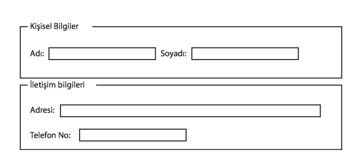 Yukarıdaki şekildeki "Kişisel Bilgiler" ve "İletişim Bilgileri" gibi form elemanlarını görsel açıdan gruplamak ve gruplara başlık vermek için kullanılan eleman adı nedir?