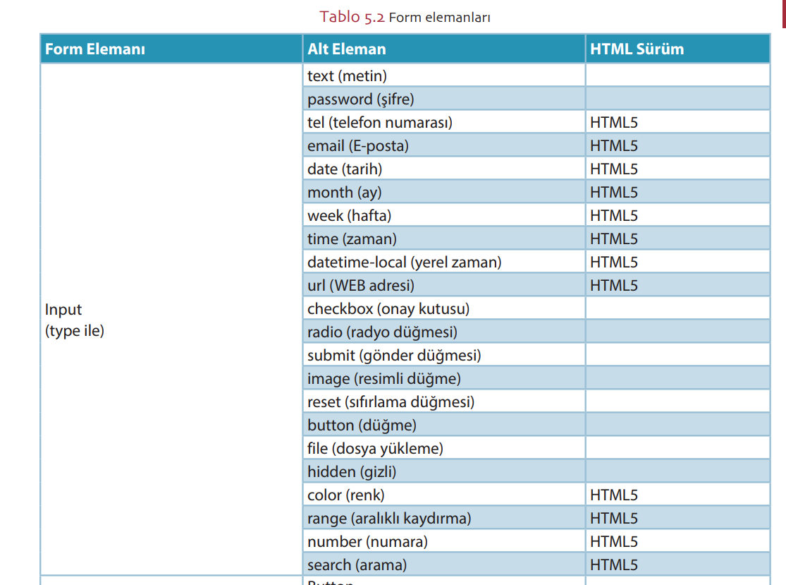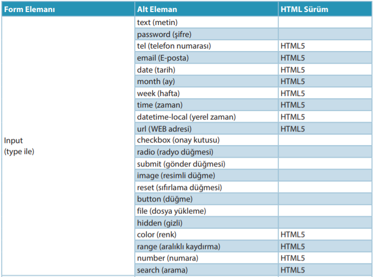 Yukarıdaki tabloda görüldüğü gibi HTML 5 ile input elemanına eklenen yeni alt elemanlar tel, email, date, month, week, time, datetime-local, url, color, range, number ve search elemanlarıdır. Buna göre doğru yanıt C seçeneğidir.