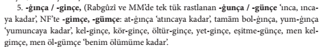 Yalnıca d seçeneğindeki -ġınça / -ginçe zarf-fiil eki “-ncaya / - inceye kadar” işlevindedir.