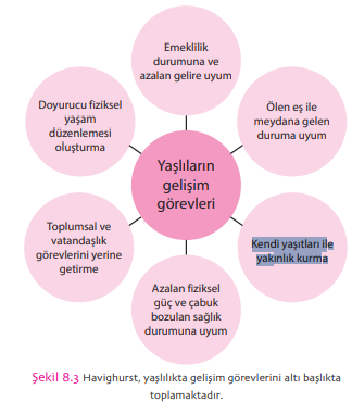 Havighurst, yaşlılıkta gelişim görevlerini altı başlıkta toplamaktadır: (1) Emeklilik durumuna ve azalan gelire uyum, (2) Ölen eş ile meydana gelen duruma uyum, (3) Kendi yaşıtları ile yakınlık kurma, (4) Azalan fiziksel güç ve çabuk bozulan sağlık durumuna uyum, (5) Toplumsal ve vatandaşlık görevlerini yerine getirme, (6) Doyurucu fiziksel yaşam düzenlemesi oluşturma.