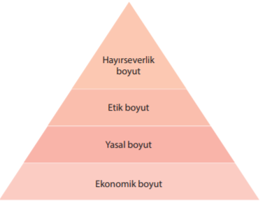 Kurumsal sosyal sorumluluk piramidinin en altında “Ekonomik boyut”, ikinci katmanda “Yasal boyut”, üçünce katmanda “Etik boyut” ve en üst katmanda “Hayırseverlik boyutu” yer alır.
