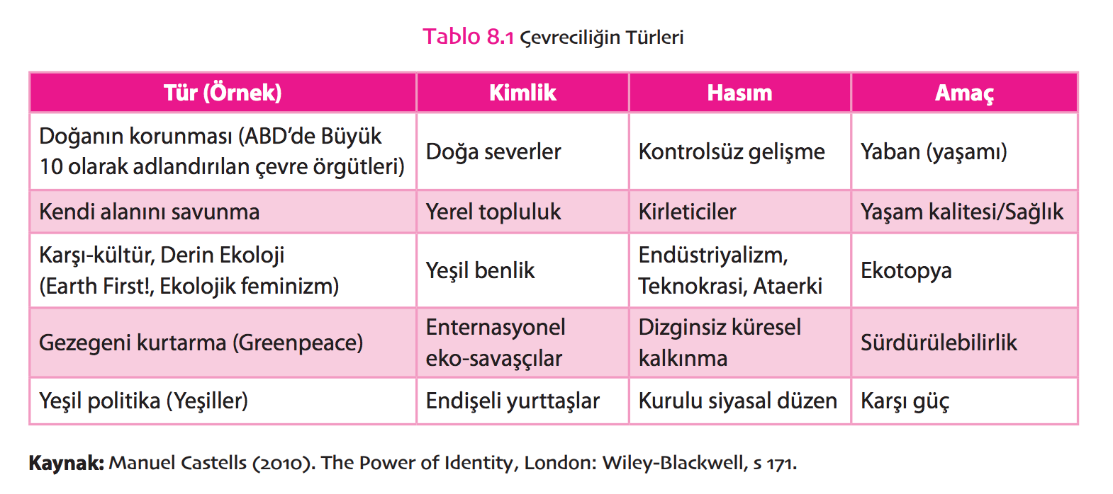 Kimliği yeşil benlik ve amacı ekotopya olan grubun çevrecilik türü ve hasmı hangi şıkta doğru olarak verilmiştir?