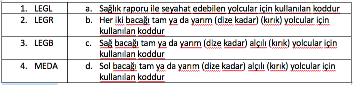 LEGR (Leg Right): Sağ bacağı tam ya da yarım (dize kadar) alçılı (kırık) yolcular için kullanılan koddur (MEDA kodu ile birlikte kullanılır).