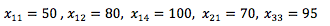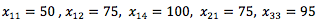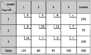 Aşağıda bir problemin ulaştırma tablosu verilmiştir. Bu problemin, kuzeybatı köşe yöntemi ile bulunan başlangıç çözümünde, atama yapılan hücreler ve değerleri için aşağıdakilerden hangisi doğrudur?