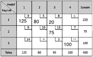 - Her doğru üzerinde sıfır değerli hücreler esas alınarak, her i için yalnız bir j olmak üzere, eniyi çözüme karşı gelen xij değerleri yazılıp, eniyi çözüm bulunur.