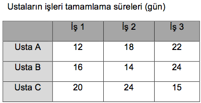 Bir şirkette çalışan üç ustanın (A, B, C) her birinin bir işte çalışması istenmektedir. Tamamlanması istenen üç iş vardır. Her ustanın sahip olduğu bilgi, beceri ve yetenek seviyesine bağlı olarak işleri farklı sürelerde bitirecekleri tahmin edilmektedir. Ustaların işleri tamamlayacakları tahmini süreler aşağıdaki tabloda verilmiştir. Her ustanın sadece bir işte çalışması ve her işe de sadece bir kişinin atanması isteniyorsa, işlerin en kısa sürede tamamlanması için hangi ustanın hangi işte çalışması gerektiğini çözümleyen Macar modeli aşağıdakilerden hangisidir ?