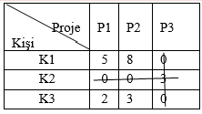 Bu tablodan “0”ların 3 çizgi ile kapanabileceği görülmektedir. En uygun atama ise,