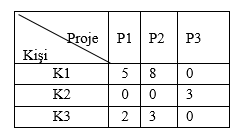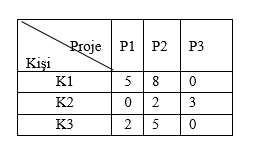 1.adım: Tablonun her bir satırındaki en küçük eleman belirlenir ve bu değer ait olduğu satırdaki diğer değerlerden çıkartılarak satır indirgemeli fırsat maliyetleri tablosu elde edilir. Örneğin 1. kişiye P2 verilirse 14 maliyete katlanılacaktır. Fakat aynı kişi 3. projeyi 6 maliyetle yapabilmektedir. Bu durumda 14-6=8 birimlik fırsat maliyeti elde edilmiş olur. Benzer işlemler diğer kişiler içinde yapılır ve aşağıdaki tablo elde edilir.