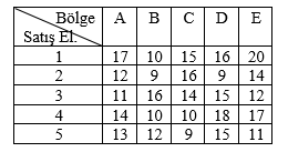 Atlas Ecza Şirketi 5 satış elemanını 5 bölgede görevlendirecektir. Daha önceki performansları, bu bölgede kazanılan ortalama iş bağlantıları şeklinde değerlendirilmiştir. Tabloda ortalama iş bağlantıları verildiğine göre aşağıdakilerden hangisi optimum atama değeridir?
