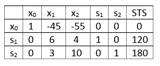 Amaç fonksiyonu değeri en büyük olan değişken x2 temele girecek değişkendir. Temelden çıkacak değişken ise enk(120/4,180/10)=enk(30,18)=18 olup karşı gelen s2 değişkeni temelden çıkacak değişkendir.