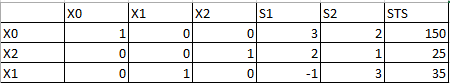 Bir matematiksel modelin en iyi çözümünün elde edildiği simpleks tablo aşağıdaki gibidir. Problem en büyükleme problemidir ve amaç fonksiyonu şu şekildir: Enb X0 = 2X1 + X2
